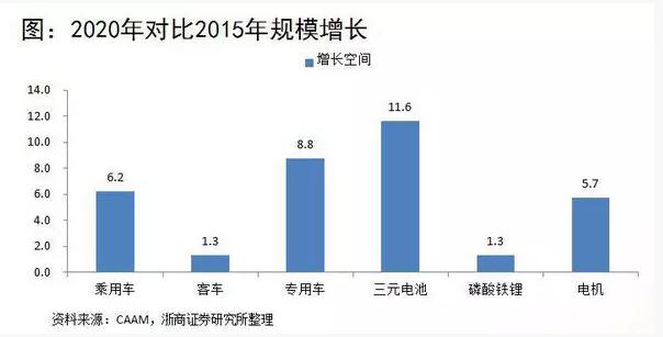 如果再進(jìn)行橫向?qū)Ρ?,就是我將各個(gè)新能源汽車的部件2020年的規(guī)模與2015年進(jìn)行對(duì)比,三元電池在它的關(guān)鍵零部件以及整車中也是彈性最大的一個(gè)部分。