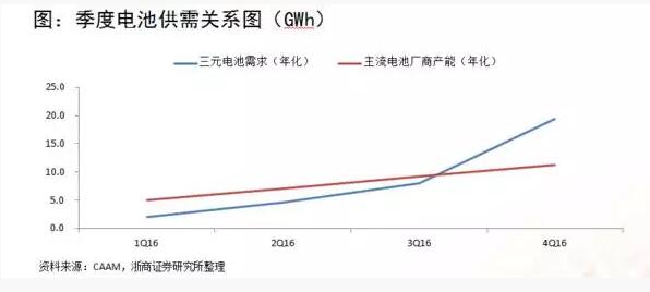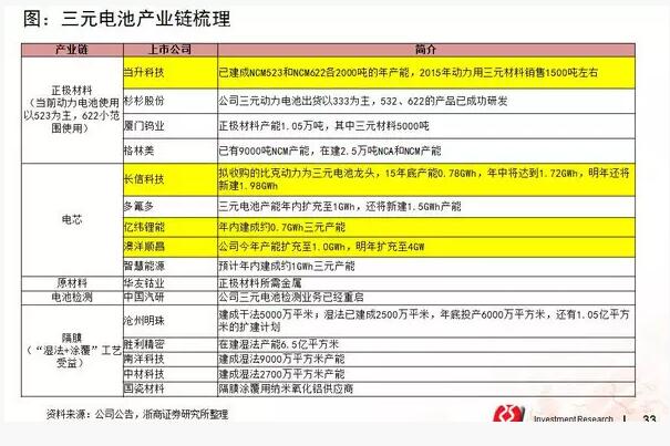 從整車廠和電池企業(yè)的關(guān)系看,力神電池、CATL、比克電池的客戶資源相對(duì)較好,他們可能在三元電池的競(jìng)爭(zhēng)中占據(jù)了一個(gè)領(lǐng)先的聲威,但其實(shí)三元電池行業(yè)在2015年下半年開始起步,因此整個(gè)客戶關(guān)系在未來(lái)可能進(jìn)行一個(gè)重構(gòu),所以我們也密切跟蹤客戶關(guān)系的重構(gòu),從而找到投資機(jī)會(huì)的所在。
