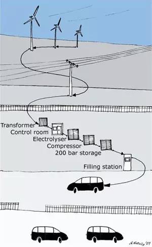 可再生能源如光伏、風(fēng)電場、海洋能等生產(chǎn)的電力是間歇性的、不穩(wěn)定的,而且多數(shù)在電力需求小的邊遠(yuǎn)地區(qū)。如果能夠聯(lián)網(wǎng)直接供給消費(fèi)地如沿海地區(qū),問題就簡單了,當(dāng)其再生電力無法使用,于是產(chǎn)生“棄風(fēng)限電”這種現(xiàn)象。圖2表示風(fēng)電場產(chǎn)生的電力過剩,采用電解水產(chǎn)生氫,然后注入燃料電池汽車。電解生產(chǎn)的氫經(jīng)由壓縮機(jī)儲存在200 bar(1 bar=0.98692標(biāo)準(zhǔn)氣壓)的儲罐里,以便供應(yīng)給燃料電池汽車。