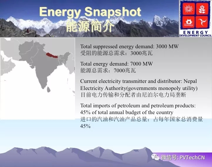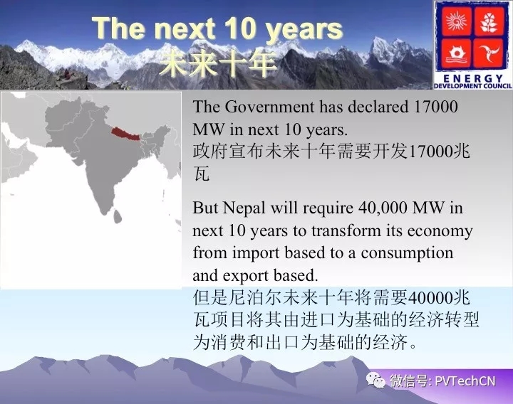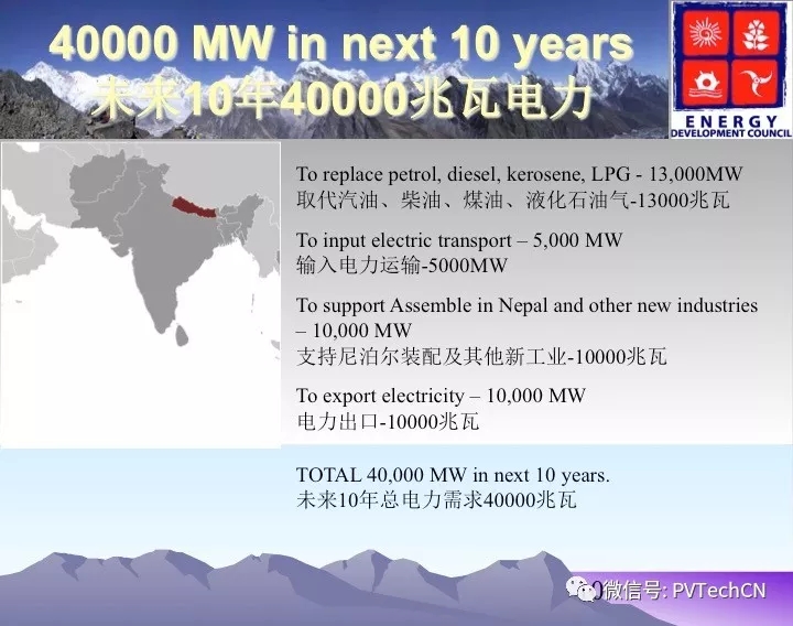 他表示:尼泊爾能源總需求7000兆瓦,目前電力傳輸和分配者由尼泊爾電力局壟斷,政府宣布未來十年需要開發(fā)17000兆瓦,需求的能源儲備為3400MW-8000MW。