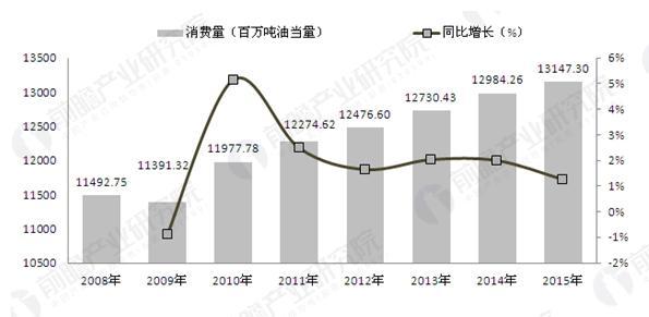 2008-2015年全球能源消費(fèi)總量及同比增速(單位:百萬噸油當(dāng)量,%)
