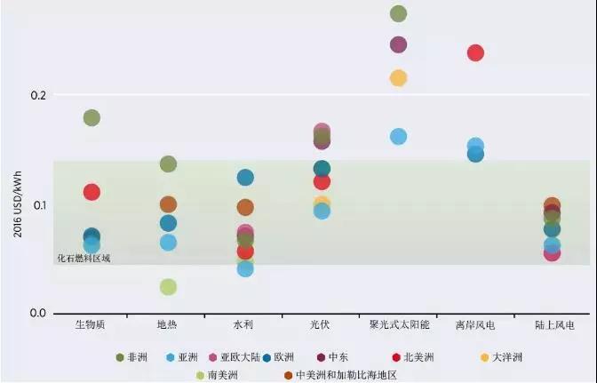 在可再生能源資源具備經(jīng)濟(jì)性的未開發(fā)地區(qū),生物質(zhì)能、水電和陸上風(fēng)能都能提供低成本的電力。太陽(yáng)能光伏發(fā)電(PV)、海上風(fēng)電和聚光式太陽(yáng)能發(fā)電(CSP)的電力成本也在近期快速下降。這意味著無(wú)論是現(xiàn)在還是未來(lái)幾年,當(dāng)這些可再生能源電站投入運(yùn)行時(shí),可再生能源技術(shù)可以提供有競(jìng)爭(zhēng)力的電力。
