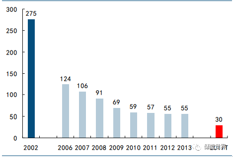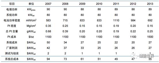 工業(yè)化和商業(yè)化的絕大多數(shù)問題都可以歸結(jié)到成本之上,燃料電池亦不例外。近 10 年來,燃料電池的成本控制一直是研究機構(gòu)和實業(yè)界最重要的目標之一。孜孜不倦的努力也取得了回報,基于 2013 年的技術水平,在年產(chǎn) 50000 套的規(guī)模下,車用 80kW 功率的 PEMFC 燃料電池成本降低到 55 美元/kW(請注意上述各種約束條件?。?,較之 2002 年的 275 美元/kW 下降了 80%,距離 2017 年30 美元/kW 的目標僅數(shù)步之遙(對此需要指明兩點:其一,30 美元/kW 的成本在 2008 年左右還是 2015年計劃實現(xiàn)的目標;其二,2012 年成本估算曾經(jīng)低至 47 美元/kW,但基于更嚴格的熱排放指標和最新的Pt 金屬價格,這一估算在 2013 年被調(diào)高了)。