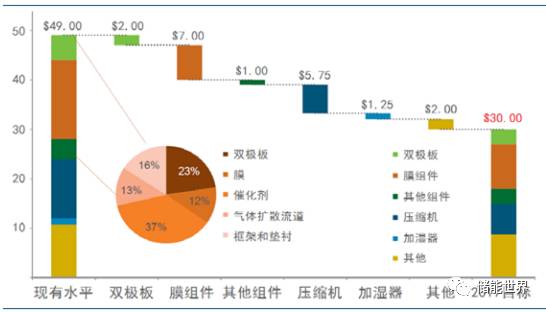 高成本是制約燃料電池產(chǎn)業(yè)化的關鍵因素。燃料電池成本中占比最高的是燃料電池組,其次是氫燃料罐和電池配件。如果未來要實現(xiàn)燃料電池商業(yè)化,并與內(nèi)燃機汽車進行競爭,那么燃料電池組的成本必須下降,其中主要涉及三個關鍵部件的成本,包括:鉑催化劑、電解質(zhì)膜和雙極板。