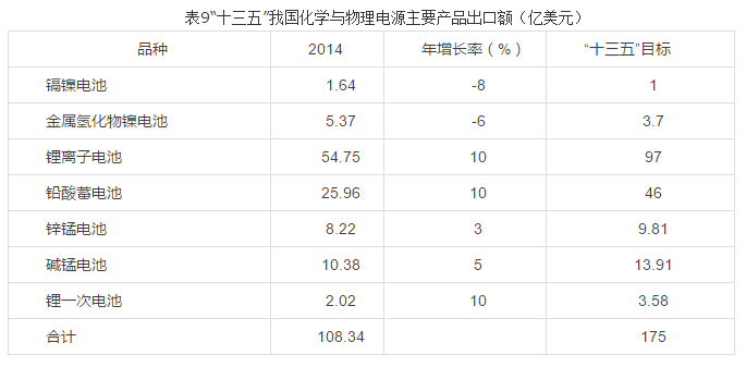 新能源產(chǎn)業(yè)作為國家“十三五”重點發(fā)展領(lǐng)域已無懸念,化學(xué)與物理電源產(chǎn)業(yè)是新能源產(chǎn)業(yè)的重要組成部分,“十三五”期間仍將保持持續(xù)、快速增長,其中傳統(tǒng)的化學(xué)電源將進入平穩(wěn)發(fā)展期,產(chǎn)業(yè)增長重點在“動力電池、儲能電池和傳統(tǒng)電池應(yīng)用”三大領(lǐng)域,增長貢獻率較大的主要電池品種有新發(fā)展IT、純電動車動力與儲能鋰離子電池和新型液流電池等;傳統(tǒng)汽車和新型汽車起停以及通信應(yīng)用鉛酸蓄電池(含鉛碳電池等)和不斷擴展應(yīng)用的鋰一次電池。2020年,我國化學(xué)與物理電源行業(yè)中的化學(xué)電源產(chǎn)品總產(chǎn)值將達到4000-5000億元左右,年平均增長率10-20%;鋰離子電池、鉛酸蓄電池將持續(xù)成為化學(xué)與物理電源行業(yè)的支柱產(chǎn)業(yè),鉛酸蓄電池保持平均8-10%增長,鋰離子電池年平均增長率20-30%;我國化學(xué)電源出口仍將保持持續(xù)快速增長的態(tài)勢,年平均增長率10-15%,出口品種增加,檔次提高,鋰離子電池將占出口總額的 55%以上?!笆濉蹦?,我國化學(xué)電源主要產(chǎn)品的產(chǎn)量、銷售收入和出口額目標分別見表 7、8、9。