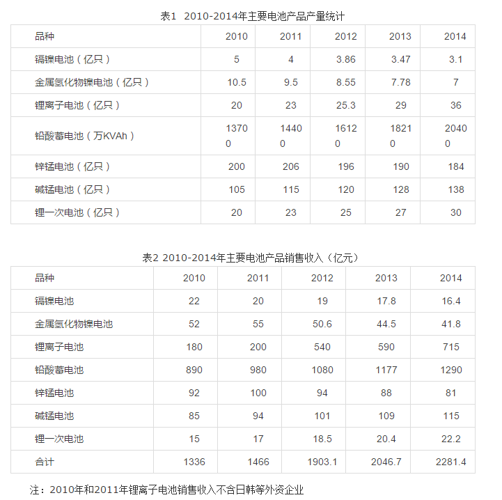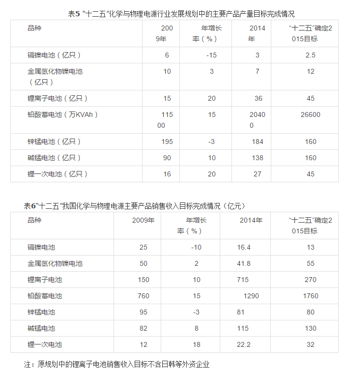 表1至表4列出我國化學(xué)與物理電源行業(yè)主要產(chǎn)品自2010-2014間的產(chǎn)量、銷售額以及出口數(shù)據(jù)統(tǒng)計(jì)。表5和表6則比較了2014年與2009年同類數(shù)據(jù)的比較,并對照了“十二五”行業(yè)發(fā)展規(guī)劃規(guī)定的相應(yīng)目標(biāo)。