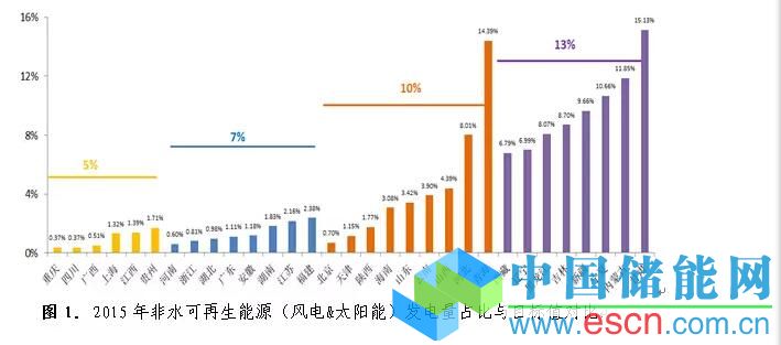 2015年末,全國各省區(qū)非水可再生能源的發(fā)電量占比情況與“意見”的差距空間如圖1所示。