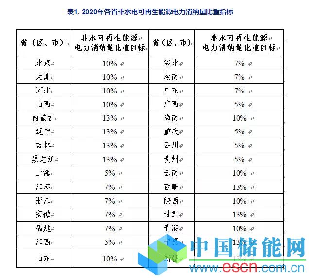 規(guī)定了全國不同省份2020年全社會用電量中的非水電可再生能源電量比重指標(表1)