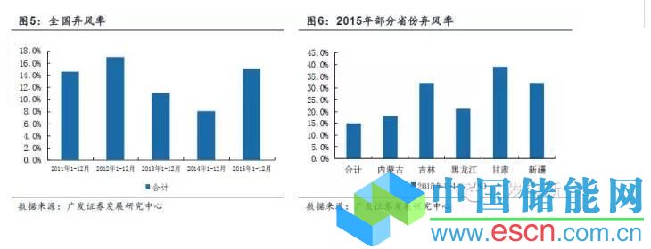2015年,風(fēng)電棄風(fēng)限電形勢加劇,全年棄風(fēng)電量339億千瓦時(shí),同比增加213億千瓦時(shí),平均棄風(fēng)率15%,同比增加7個(gè)百分點(diǎn)。其中棄風(fēng)較重的地區(qū)是內(nèi)蒙古,棄風(fēng)電量91億千瓦時(shí),棄風(fēng)率18%。甘肅棄風(fēng)電量82億千瓦時(shí),棄風(fēng)率39%。新疆棄風(fēng)電量71億千瓦時(shí),棄風(fēng)率32%。吉林棄風(fēng)電量27億千瓦時(shí),棄風(fēng)率32%。