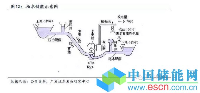 抽水蓄能是將電網(wǎng)低谷時(shí)利用過剩電力作為液態(tài)能量媒體的水從地勢低的水庫抽到地勢高的水庫,電網(wǎng)峰荷時(shí)高地勢水庫中的水回流到下水庫推動(dòng)水輪機(jī)發(fā)電機(jī)發(fā)電,效率一般為75%左右,具有日調(diào)節(jié)能力,用于調(diào)峰和備用。
