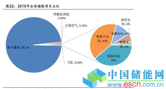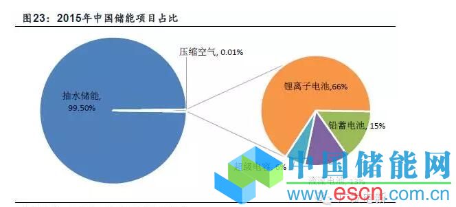 據(jù)CNESA項(xiàng)目庫不完全統(tǒng)計(jì),預(yù)計(jì)到2015年底,中國儲(chǔ)能市場的累計(jì)裝機(jī)量(2000-2015年)為21.9GW,其中抽水蓄能為21.8GW;電化學(xué)儲(chǔ)能項(xiàng)目裝機(jī)106MW,占全球電化學(xué)儲(chǔ)能項(xiàng)目裝機(jī)總?cè)萘康?2%,與2012年的4%相比,有大幅提升。近五年,中國電化學(xué)儲(chǔ)能市場的增速明顯高于全球市場,年復(fù)合增長率(2010-2015年)為110%,是全球的6倍。在中國市場,鋰離子電池裝機(jī)份額最大,為66%。其次是鉛蓄電池和液流電池,比例分別為15%和13%。