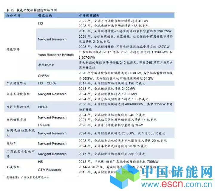 HIS、Navigant Research、Yano ResearchInstitute、摩根斯坦利、CNESA、GTM Research等研究機(jī)構(gòu)都對儲(chǔ)能市場做了相關(guān)預(yù)測,不同的機(jī)構(gòu)預(yù)測結(jié)果雖不相同,但對未來儲(chǔ)能市場的規(guī)模和發(fā)展都是樂觀的。