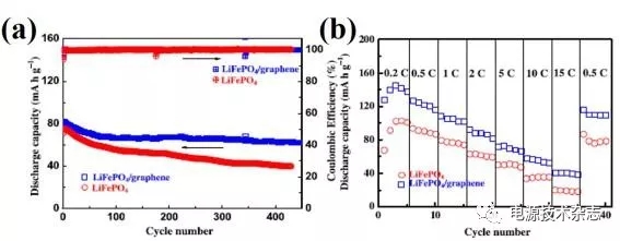 LiFePO4也是鋅基鋰電池理想的正極活性物質(zhì)。Yuan等采用水熱法合成了LiFePO4和石墨烯的復合物,并首次運用在鋅基鋰體系中。6LiFePO4為電池提供高容量(145 mAhg-1),石墨烯為電子在正極中的傳輸提供快速遷移的通道。450圈循環(huán)后,LiFePO4/石墨烯復合正極容量保持率高達87.5%,且?guī)靷愋时3?00% (圖3a)。在15C高倍率充放電下,電池的容量為40mAhg-1,表現(xiàn)出優(yōu)異的倍率性能(圖3b)。與LiMn2O4相比,LiFePO4具有更高的理論容量和更低的工作電壓,因此在水系電池中有著光明的應(yīng)用前景。