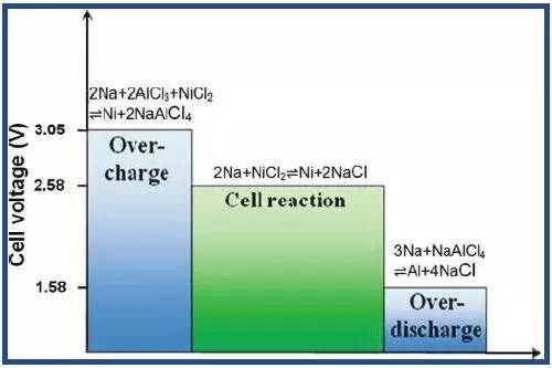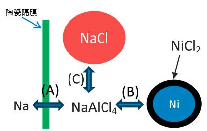 放電時(shí),正極的Ni2+得到電子,生成Ni單質(zhì),負(fù)極單質(zhì)Na失去電子,生成Na+穿過陶瓷隔離膜,與正極電解液中的Cl-結(jié)合為NaCl。電池的運(yùn)行溫度為270-350℃,開路電壓2.58V(300℃),電子轉(zhuǎn)移數(shù)為2。