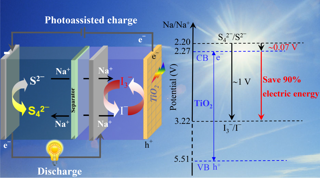 近日,日本國立產(chǎn)業(yè)技術(shù)綜合研究所(AIST)首席研究員、筑波大學(xué)和南京大學(xué)兼職教授周豪慎,AIST博士后李娜和筑波大學(xué)博士研究生李琪等,首次將二氧化鈦(TiO2)光電極嵌入到新型鈉離子電池的正極,實(shí)現(xiàn)了太陽能的高效轉(zhuǎn)化和存儲(chǔ)。該光輔助可充電鈉離子電池利用水系的Na2S4 陽極電解液和NaI陰極電解液分別作為電池的負(fù)極及正極的活性物質(zhì),并且將TiO2光電極嵌入正極電解液中作為太陽能轉(zhuǎn)化及存儲(chǔ)基元。當(dāng)電池在模擬太陽光照下充電時(shí),TiO2光電極受光激發(fā)產(chǎn)生電子和空穴。躍遷到導(dǎo)帶的電子通過外電路傳到電池的負(fù)極可使Na2S4還原為Na2S,同時(shí)留在價(jià)帶的空穴氧化NaI為NaI3。而該電池的放電過程與傳統(tǒng)鈉離子電池的相似,在電池的負(fù)極和正極可分別通過Na2S/Na2S4氧化及NaI3/NaI還原轉(zhuǎn)化達(dá)到化學(xué)能到電能的轉(zhuǎn)變。由于光電勢的補(bǔ)償,電池的充電電位平臺(tái)降為0.08 V。超低的充電電勢平臺(tái)明顯低于放電電勢平臺(tái),致使電池的能量轉(zhuǎn)換效率高達(dá)190%,相當(dāng)于節(jié)省了近90%的輸入電能。該項(xiàng)研究成果為開發(fā)低成本、高安全性能光電轉(zhuǎn)化存儲(chǔ)設(shè)備提供了新的思路,同時(shí)推動(dòng)了光充電電池的實(shí)際應(yīng)用。相關(guān)結(jié)果已在線發(fā)表于Advanced Energy Materials (DOI: 10.1002/aenm.201600632)。