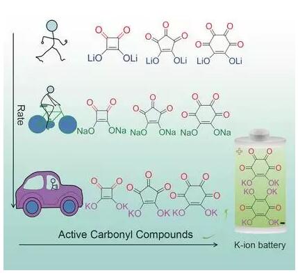 以具有不同金屬離子和框架的碳氧化物金屬鹽(M2(CO)n,M=Li,Na,K)作為有機(jī)電極材料,構(gòu)建鋰離子電池、鈉離子電池或者鉀離子電池?;贙2C6O6和K4C6O6,首次得到了具有搖椅反應(yīng)機(jī)理的K離子電池。