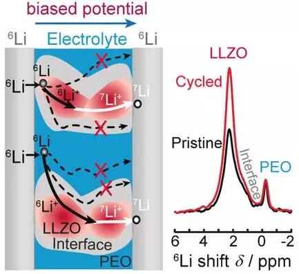 首次用實(shí)驗(yàn)數(shù)據(jù)證明了,全固態(tài)電池中,鋰離子通過(guò)復(fù)合陶瓷電解質(zhì)擴(kuò)散。6,,7Li NMR和同位素交換證明,鋰離子主要是通過(guò) LLZO擴(kuò)散,而不是LLZO-PEO界面或者PEO相。