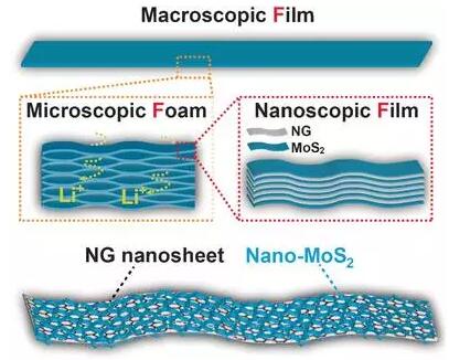 為了解決MoS2作為鋰離子電池負(fù)極材料所面臨的導(dǎo)電性低、循環(huán)性差和速率慢等問(wèn)題,以超薄MoS2和N摻雜的石墨烯為原料,構(gòu)建了一種膜-泡沫-膜(film-foam-film)結(jié)構(gòu),具有超快速Li+/e-傳輸能力,并能夠適應(yīng)充放電過(guò)程中的體積變化,具有超高的Li儲(chǔ)存性能。