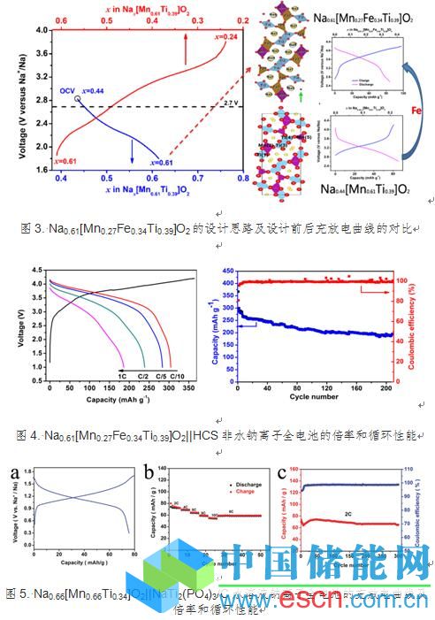 在認(rèn)識(shí)了隧道結(jié)構(gòu)中各個(gè)過渡金屬的占位和價(jià)態(tài)以及電荷補(bǔ)償機(jī)制的基礎(chǔ)上,博士生徐淑銀和胡勇勝研究員等提出了一種正極材料設(shè)計(jì)方法(如圖3所示),將具有高電位的Fe4+/Fe3+氧化還原電對(duì)引入到Ti取代的樣品的放電態(tài)Na0.61[Mn0.61Ti0.39]O2中,設(shè)計(jì)出了空氣中穩(wěn)定、具有高鈉含量、基于Fe的隧道型氧化物正極材料Na0.61[Mn0.27Fe0.34Ti0.39]O2。谷林研究員通過高分辨球差校正電鏡確定了該材料中的各原子占位及其充放電過程中結(jié)構(gòu)的變化。該正極材料在2.5-4.2 V電壓范圍內(nèi),其首周可逆容量可達(dá)90 mAh/g,同時(shí)表現(xiàn)出了較高的放電電壓(3.56 V);磁學(xué)國家重點(diǎn)實(shí)驗(yàn)室M04組楊海濤副研究員及成昭華研究員采用穆斯堡爾譜證實(shí)了充放電過程中Fe4+/Fe3+氧化還原電對(duì)參與電化學(xué)反應(yīng),這是首次在隧道型氧化物中實(shí)現(xiàn)Fe4+/Fe3+氧化還原電對(duì)的可逆轉(zhuǎn)變。使用該正極和硬碳負(fù)極組裝的非水鈉離子全電池的能量密度可達(dá)224 Wh/kg(根據(jù)正負(fù)極質(zhì)量之和計(jì)算得到),顯示了較好的倍率及循環(huán)性能(圖4)。更為重要的是,該材料中所使用的元素Na、Fe、Mn、Ti均在地殼中含量豐富、環(huán)境友好,適合發(fā)展大規(guī)模儲(chǔ)能用鈉離子電池。