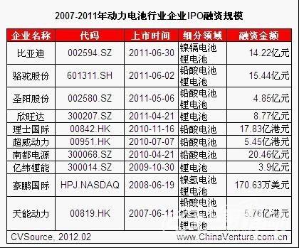 表3 2007-2011年動力電池行業(yè)企業(yè)IPO融資規(guī)模