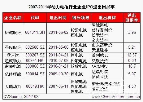 表4 2007-2011年動力電池行業(yè)企業(yè)IPO退出回報(bào)率