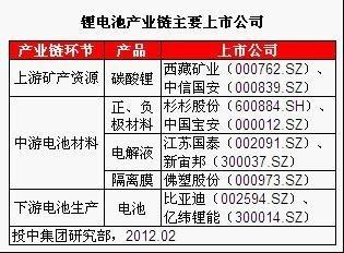 相對于鉛酸電池、鎳鎘電池、鎳氫電池等動力電池,鋰電池具有比能量高、循環(huán)壽命長、自放電率小、無記憶效應(yīng)和綠色環(huán)保等突出優(yōu)勢。近年來,國內(nèi)鋰電池產(chǎn)業(yè)經(jīng)過不斷的發(fā)展與積累已經(jīng)形成一條較為完整的產(chǎn)業(yè)鏈,包括上游的鋰礦資源、中游的鋰電池材料(正極材料、負(fù)極材料、電解液、隔離膜等)以及下游的電池生產(chǎn)(見表5)?! ?/div>
