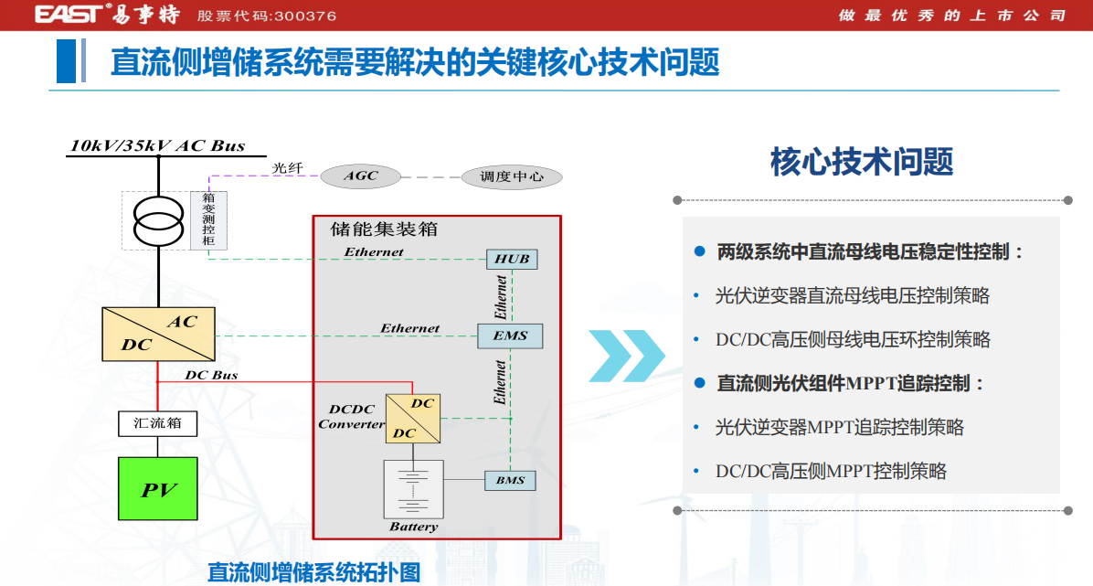在原有的光伏系統(tǒng)的直流側增加儲能系統(tǒng),基于此核心的配置在現(xiàn)有的基礎上把我們的儲能,包括DC雙向變換器、監(jiān)控系統(tǒng)等加進去,我們要側重于哪個方面呢?基于光伏電站直流側增儲控制策略,要對棄光電量進行一個可控的管理。我們的監(jiān)控系統(tǒng)、能量管理系統(tǒng)和發(fā)指令的速度,關于AGC下發(fā)的光伏限發(fā)指令,基于此,我們遇到兩個問題,在原有的光伏發(fā)電系統(tǒng),把儲能加進去之后價格就變了,從原來組建的發(fā)電系統(tǒng)變成了儲能電池組或者DC/DC高壓側系統(tǒng),這樣要把儲能的工作和責任分清楚。比如光伏直變器只管發(fā),對于母線的控制誰去管?這些方面的問題是需要解決的,這些問題解決不了,在光伏電站儲能的方面會出現(xiàn)這樣那樣的問題。在這里面兩級系統(tǒng)中直流母線電壓穩(wěn)定性控制是需要考慮到的問題。