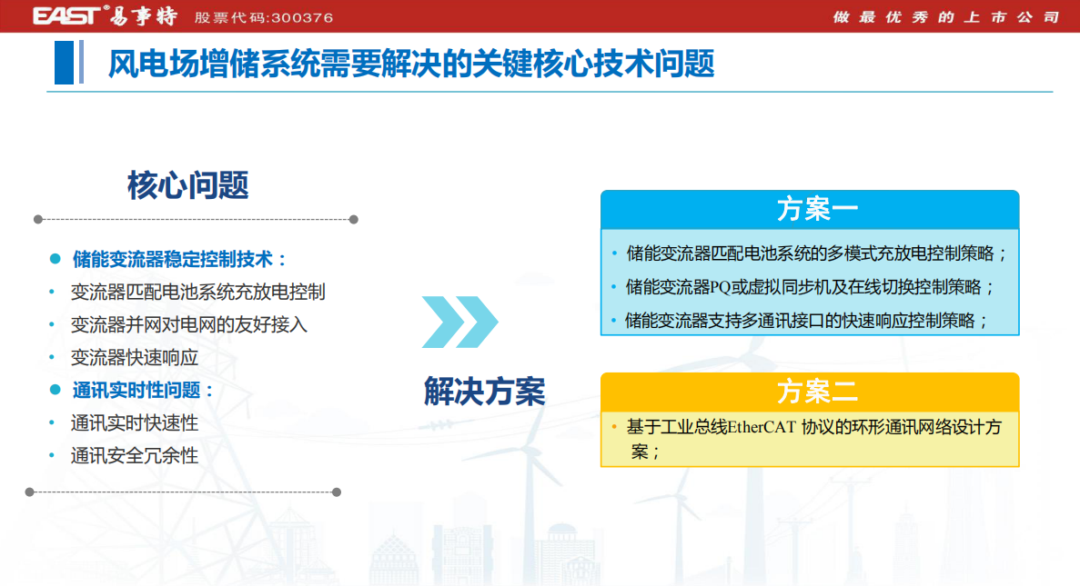 風電上的儲能目前是比較熱的,我們針對690伏的系統(tǒng)解決方案,主打的配置是目前研究的一兆瓦的儲能變流器。風電廠儲能不管是變流器控制還是其他的方案都是比較成熟的,從我們的角度來看有幾個方面需要解決。一是變流器和電池系統(tǒng)的匹配問題,二是變流器并網(wǎng)對電網(wǎng)的影響沖擊是最小,三是調動實時性問題,要快速的響應。針對這些問題我們提出兩個解決方案,一是儲能變流器匹配電池系統(tǒng)的多模式充放電控制策略,儲能變流器PQ或虛擬同步機及在線切換控制策略,儲能變流器支持多通訊接口的快速響應控制策略。二是基于工業(yè)總線EtherCAT協(xié)議的環(huán)行通訊網(wǎng)絡方案。