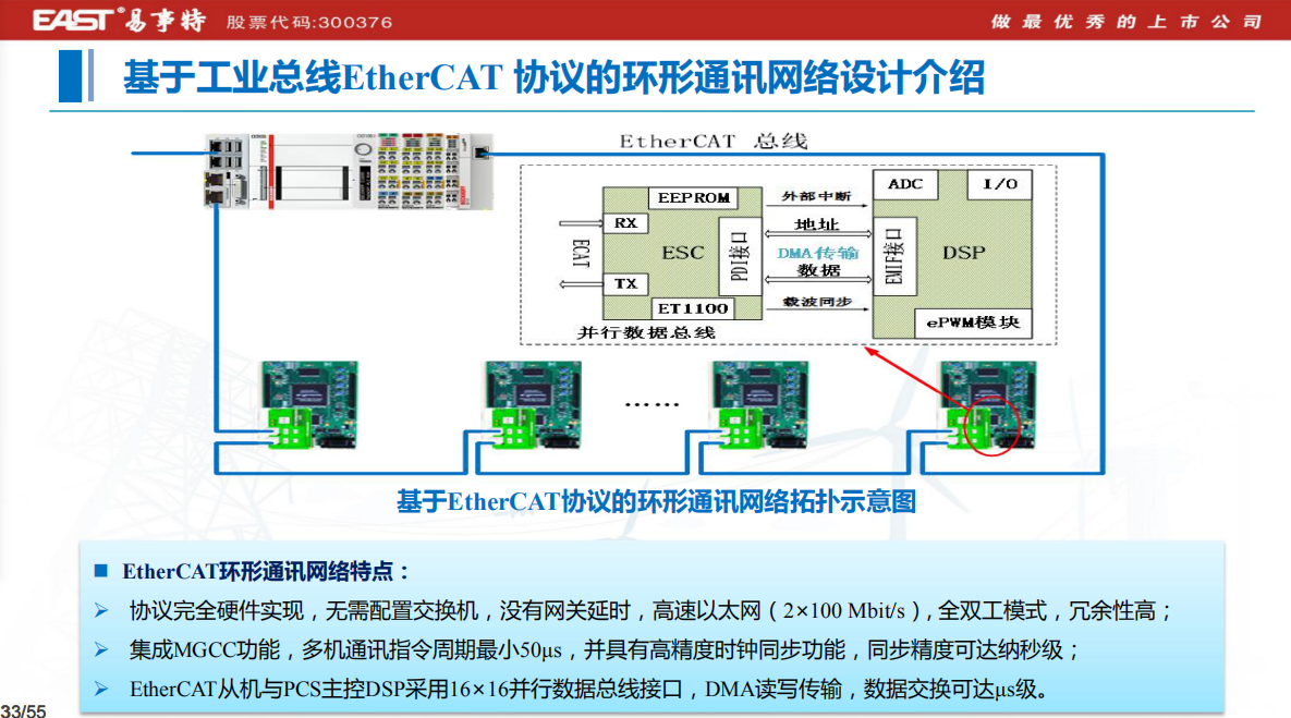 基于工業(yè)總線EtherCAT協(xié)議的環(huán)行通訊網(wǎng)絡設計,協(xié)議完全硬件實現(xiàn),無需配置交換機,沒有網(wǎng)關延時,高速以大網(wǎng)、全雙工模式,冗余性高。并且有高精度時鐘同步功能,同步精度可達納秒級。我發(fā)一個指令變流器接收到以后響應的時間有多少呢?這對于風電廠的運營單位是比較關心的,0.11秒就可以達到,這是我們測試的結果。