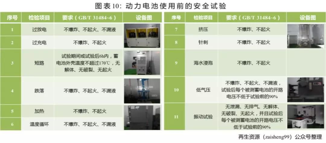 電池的結(jié)構(gòu)設(shè)計(jì),管理系統(tǒng)的優(yōu)化為安全性提供保障,如發(fā)展高靈敏性的熱控制技術(shù)(PTC熱敏電阻),頂蓋設(shè)有安全閥(出氣孔)等。每個(gè)商業(yè)化的動(dòng)力電池進(jìn)入市場(chǎng)前都必須經(jīng)過(guò)嚴(yán)格的質(zhì)量檢驗(yàn),常見(jiàn)的檢驗(yàn)方法、標(biāo)準(zhǔn)及檢驗(yàn)設(shè)備如表10所列。