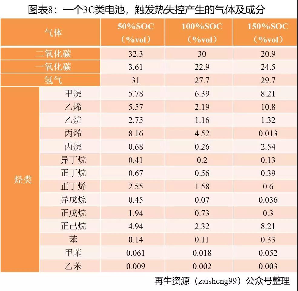 電化學(xué)反應(yīng)釋放的氣體和熱量使得電池內(nèi)壓和溫度升高超過(guò)了承受限度,例如一個(gè)40Ah的NCM/C軟包電池,電解液為溶質(zhì)LiPF6和溶劑EMC/DEC/EC,在充滿(mǎn)電時(shí),通過(guò)針刺觸發(fā)熱失控,釋放出的氣體成分包括EMC、DEC、EC、苯、甲苯、苯乙烯、聯(lián)苯、丙烯醛、一氧化碳、氟化氫等易燃易爆有害氣體;一個(gè)3C消費(fèi)類(lèi)電池,材料為L(zhǎng)iCoO2/C,2.1Ah軟包,7.7Wh容量,觸發(fā)熱失控后產(chǎn)生的氣體種類(lèi)及含量如表8所示,充電狀態(tài)SOC(State of Charge)分別為50%、100%、150%時(shí),陸續(xù)釋放的氣體體積分別是0.8L、2.5L、6.0L,電池包被漲破,氣體快速冒出,能量聚集到一定程度而起火或爆炸。