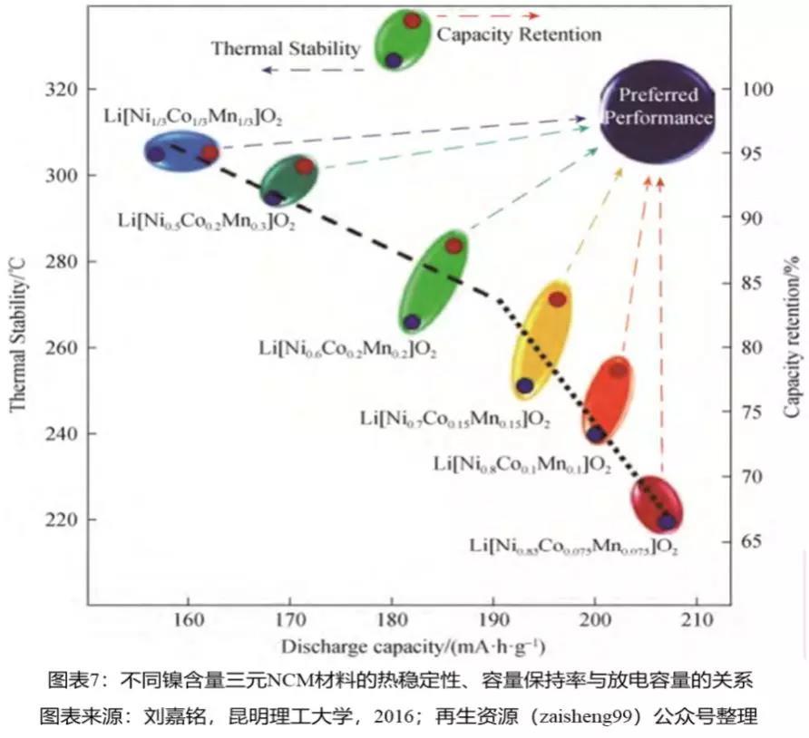 目前鋰離子動(dòng)力電池在乘用車(chē)和商用車(chē)應(yīng)用較多的分別是三元電池、磷酸鐵鋰電池,三元電池向高安全和高能量密度方向發(fā)展,這實(shí)際上是矛盾的,三元NCM或NCA均往高鎳方向發(fā)展,能量密度隨之提高,但電池安全性也隨之降低。從圖7看出,高含量Ni4+容易氧化電解液,釋放氣體,破壞材料晶體結(jié)構(gòu),導(dǎo)致熱穩(wěn)定性下降,影響電芯安全性。