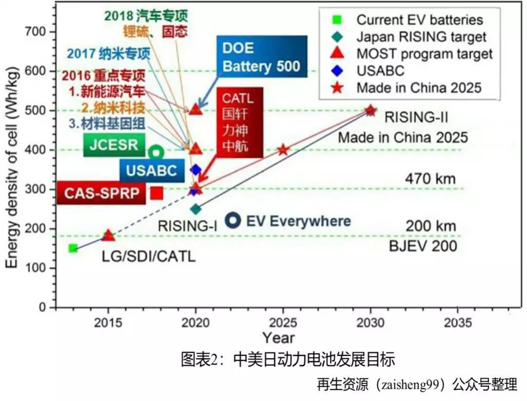 通常鋰電池在3C產(chǎn)品應(yīng)用較成熟,近年在新能源汽車(chē)和儲(chǔ)能領(lǐng)域存在爆發(fā)式的增長(zhǎng)需求,目前我國(guó)儲(chǔ)能電池市場(chǎng)規(guī)模還沒(méi)完全釋放,而新能源汽車(chē)動(dòng)力電池市場(chǎng)已成為各國(guó)爭(zhēng)相競(jìng)技的賽場(chǎng)。從圖2看出,美國(guó)制定的長(zhǎng)期目標(biāo)為開(kāi)發(fā)能量密度>200Wh/kg的PHEV-100+和EV用二次電池,日本新能源產(chǎn)業(yè)技術(shù)綜合開(kāi)發(fā)機(jī)構(gòu)(NEDO)計(jì)劃至2020年達(dá)到250Wh/kg,2030年達(dá)到500-700Wh/kg,中國(guó)規(guī)劃至2020年,新型鋰離子動(dòng)力電池單體比能量超過(guò)300Wh/kg,系統(tǒng)比能量力爭(zhēng)達(dá)到260Wh/kg,至2025年,單體比能量達(dá)500Wh/kg。