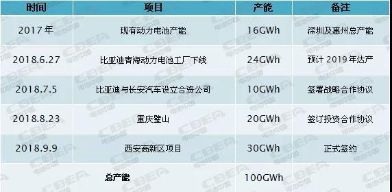 據(jù)電池中國(guó)網(wǎng)了解,截止到2017年年底,比亞迪動(dòng)力電池的總產(chǎn)能是16GWh,其中6GWh是三元電池,10GWh是磷酸鐵鋰電池;2018年6月27日,比亞迪規(guī)劃產(chǎn)能24GWh的青海動(dòng)力電池工廠正式下線,預(yù)計(jì)2019年全部投產(chǎn);7月5日,比亞迪與長(zhǎng)安汽車簽署戰(zhàn)略合作協(xié)議,成立動(dòng)力電池合資公司,規(guī)劃產(chǎn)能10GWh;8月23日,比亞迪與重慶璧山區(qū)政府就動(dòng)力電池年產(chǎn)20GWh產(chǎn)業(yè)項(xiàng)目簽訂投資合作協(xié)議;9月9日,比亞迪30GWh動(dòng)力電池項(xiàng)目簽約儀式在西安高新區(qū)舉行。至此,比亞迪動(dòng)力電池規(guī)劃總產(chǎn)能已達(dá)100GWh。動(dòng)力電池應(yīng)用分會(huì)統(tǒng)計(jì)數(shù)據(jù)顯示,2017年全國(guó)動(dòng)力電池出貨量才不過(guò)44.66GWh,而僅僅比亞迪一家其簽約產(chǎn)能就超過(guò)了這一數(shù)字的兩倍,更何況還有動(dòng)力電池出貨量在比亞迪之上的寧德時(shí)代!