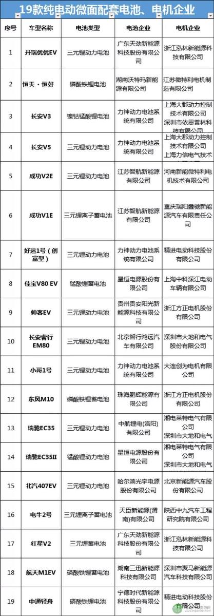 19款電動(dòng)微面的電池由12家企業(yè)提供,其中4款由力神動(dòng)力電池提供,2款由天勁新能源提供,2款由江蘇智航新能源提供,2款由星恒電源提供,其余9款有中航鋰電、寧德時(shí)代、鵬輝能源、三迅新能源、陽(yáng)光新能源、光宇電源、天臣新能源、沃特瑪新能源,智行鴻遠(yuǎn)汽車等提供。