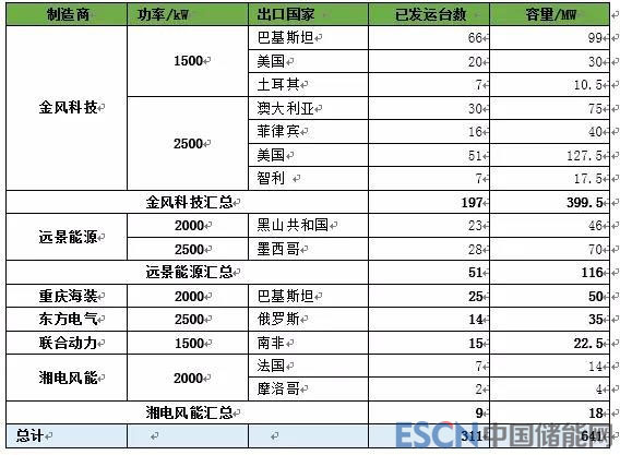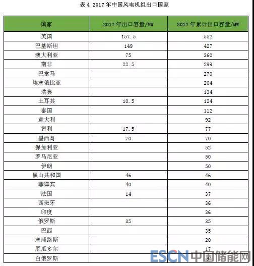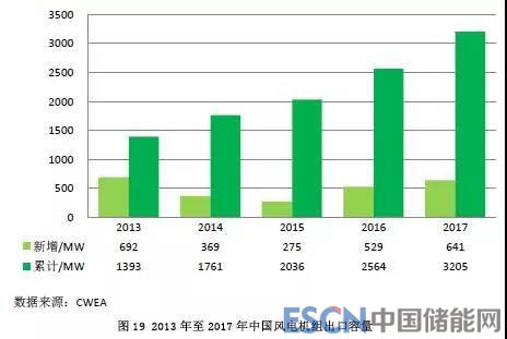 2017年,中國向國外出口風(fēng)電機(jī)組311臺,容量641MW,同比增長21%。截至2017年底,中國風(fēng)電機(jī)組制造企業(yè)已出口的風(fēng)電機(jī)組共計1707臺,累計容量達(dá)到3205MW。