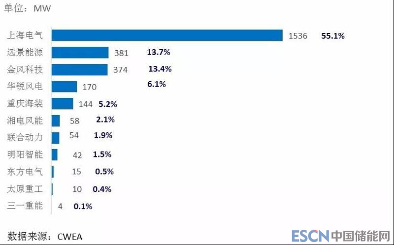 截至2017年底,海上風(fēng)電機(jī)組整機(jī)制造企業(yè)共11家,其中,累計裝機(jī)容量達(dá)到15萬千瓦以上有上海電氣、遠(yuǎn)景能源、金風(fēng)科技、華銳風(fēng)電,這4家企業(yè)海上風(fēng)電機(jī)組累計裝機(jī)量占海上風(fēng)電總裝機(jī)容量的88%,上海電氣以55%的市場份額遙遙領(lǐng)先。