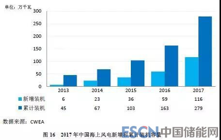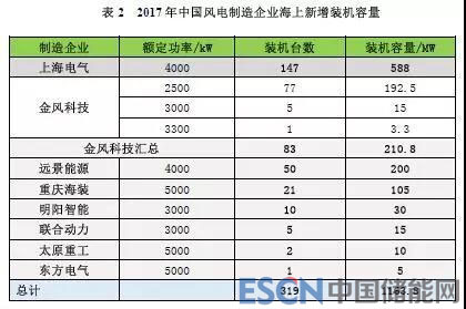 2017年,中國海上風(fēng)電取得突破進(jìn)展,新增裝機(jī)共319臺,新增裝機(jī)容量達(dá)到116萬千瓦,同比增長97%;累計裝機(jī)達(dá)到279萬千瓦。2017年共有8家制造企業(yè)有新增裝機(jī),其中,上海電氣新增裝機(jī)容量最多,共吊裝147臺,容量為58.8萬千瓦,占比達(dá)到50.5%。