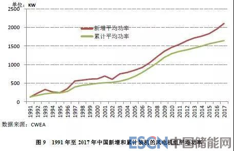2017年,中國新增裝機(jī)的風(fēng)電機(jī)組平均功率2.1MW,同比增長8%;截至2017年底,累計裝機(jī)的風(fēng)電機(jī)組平均功率為1.7MW,同比增長2.6%。