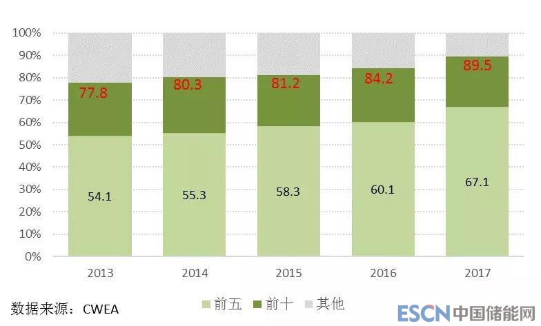 近5年,風(fēng)電整機(jī)制造企業(yè)的市場份額集中趨勢明顯。排名前五的風(fēng)電機(jī)組制造企業(yè)新增裝機(jī)市場份額由2013年的54.1%增長到2017年的67.1%,增長了13%;排名前十的風(fēng)電制造企業(yè)新增裝機(jī)市場份額由2013年的77.8%增長到2017年的77.8%增長到2017年的89.5%,增長了12%。