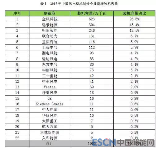 2017年,中國風(fēng)電統(tǒng)計有新增裝機(jī)的整機(jī)制造企業(yè)共22家,新增裝機(jī)容量1966萬千瓦,其中,金風(fēng)科技新增裝機(jī)容量達(dá)到523萬千瓦,市場份額達(dá)到26.6%;其次為遠(yuǎn)景能源、明陽智能、聯(lián)合動力和重慶海裝,前五家市場份額合計達(dá)到67%。