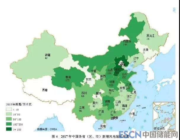 2017年,中國六大區(qū)域的風(fēng)電新增裝機(jī)容量所占比例分別為華北(25%)、中南(23%)、華東(23%)、西北(17%)、西南(9%)、東北(3%)?!叭薄钡貐^(qū)新增裝機(jī)容量占比為45%,中東南部地區(qū)新增裝機(jī)容量占比達(dá)到55%。