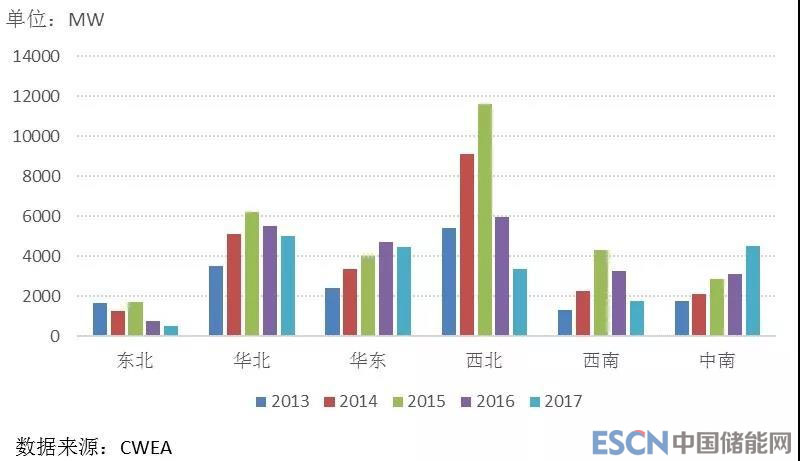 圖3 2013年至2017年中國各區(qū)域新增風(fēng)電裝機(jī)容量趨勢