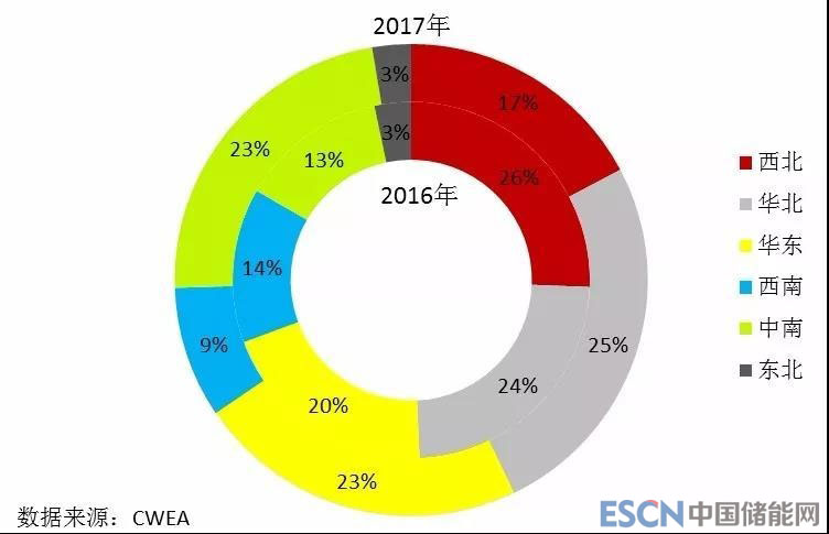 圖2 2016年和2017年中國各區(qū)域新增風(fēng)電裝機(jī)容量占比情況