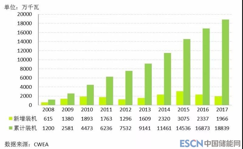 圖1 2008年至2017年中國新增和累計風(fēng)電裝機(jī)容量