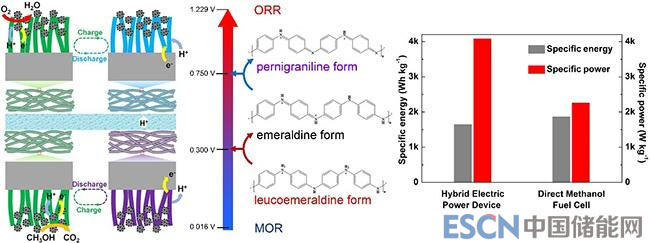 目前,大多數(shù)化學(xué)電源難以同時兼具高功率密度與高能量密度:燃料電池能量密度高,但由于液體燃料電氧化與氧電還原反應(yīng)動力學(xué)過程慢,導(dǎo)致其功率密度較低;而超級電容器功率密度較高,但受限于電極活性材料比容量,其能量密度較低。本工作中,付旭東、夏章訊等創(chuàng)新性地設(shè)計并構(gòu)筑了一種基于贗電容材料聚苯胺和電催化材料Pt/C(陰極)或PtRu/C(陽極)的新型雙效電極,借此構(gòu)建了原位直接甲醇燃料電池與超級電容器復(fù)合電源。該復(fù)合電源借助聚苯胺在陰極(氧電還原反應(yīng))與陽極(甲醇電氧化反應(yīng))電位區(qū)間可發(fā)生氧化/還原態(tài)轉(zhuǎn)變的特性,實現(xiàn)了超級電容器原位自充電。得益于聚苯胺快速的贗電容放電特性,復(fù)合電源的脈沖放電性能大幅提升,單體電池功率密度可達(dá)4kW/kg,較傳統(tǒng)直接甲醇燃料電池提高了80%以上。同時,甲醇的持續(xù)供給保障了復(fù)合電源的高能量密度。該工作闡釋的贗電容與電化學(xué)反應(yīng)耦合機(jī)制為下一代高比特性化學(xué)電源提供了新的研究思路。