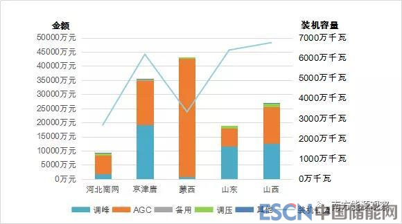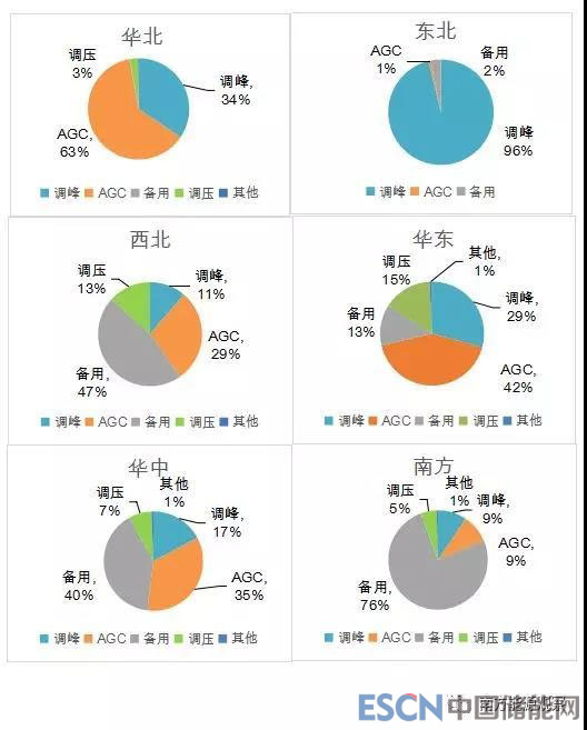 從分項(xiàng)電力輔助服務(wù)補(bǔ)償費(fèi)用來(lái)看,調(diào)峰、AGC和備用補(bǔ)償費(fèi)用占總補(bǔ)償費(fèi)用的90%以上。其中,東北、西北區(qū)域調(diào)峰補(bǔ)償力度最大,西北、華北區(qū)域調(diào)頻(西北區(qū)域調(diào)頻為AGC加一次調(diào)頻,其他區(qū)域調(diào)頻為AGC)補(bǔ)償力度最大,西北、南方區(qū)域備用補(bǔ)償力度最大??傮w來(lái)看,西北區(qū)域整體電力輔助服務(wù)補(bǔ)償力度最大(見圖3)。