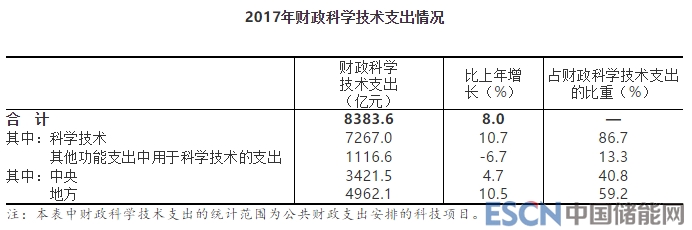2017年,國家財政科學(xué)技術(shù)支出8383.6億元,比上年增加622.9億元,增長8%;財政科學(xué)技術(shù)支出占當(dāng)年國家財政支出的比重為4.13%,與上年持平。其中,中央財政科學(xué)技術(shù)支出3421.5億元,增長4.7%,占財政科學(xué)技術(shù)支出的比重為40.8%;地方財政科學(xué)技術(shù)支出4962.1億元,增長10.5%,占比為59.2%。