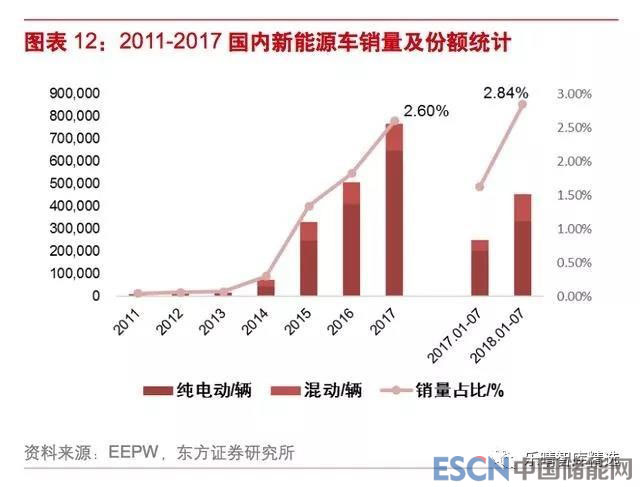 國內(nèi)新能源汽車產(chǎn)銷量從2011年不足1萬輛增加到2017年近80萬輛,6年復(fù)合增速超過100%,2017年國內(nèi)新能源汽車產(chǎn)銷量同比增長50%以上,2018年以來繼續(xù)保持高增長,前7個(gè)月國內(nèi)新能源汽車產(chǎn)銷量雙雙突破45萬輛,同比增長近80%,占國內(nèi)汽車總銷量的比例達(dá)3%以上,汽車電動化的趨勢已經(jīng)明朗。