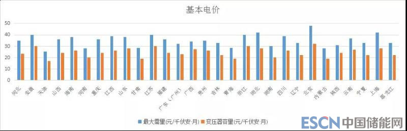 基本電價(jià)只有大工業(yè)用戶收取,分按最大需量和按變壓器容量收取。從基本電價(jià)的情況來(lái)看,按最大需量平均為35.1元/千瓦˙月,按變壓器容量平均約為24.4元/千瓦˙月,北京最高,天津最低。